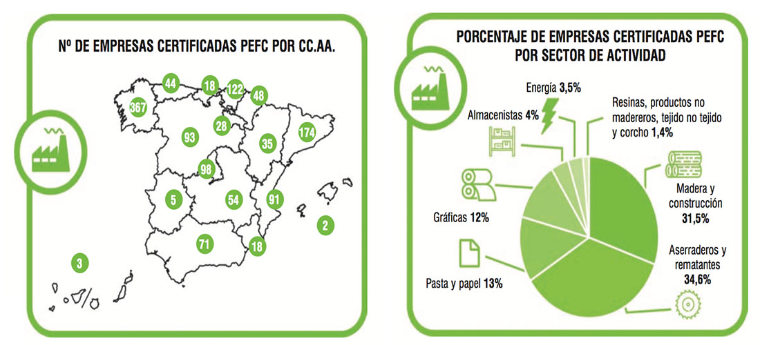 En 2016 se ha producido un incremento del 12% en las empresas certificadas en Cadena de Custodia que han apostado por la certificación PEFC como herramienta para ofrecer a sus clientes garantías de sostenibilidad en la madera y sus productos derivados, son un total de 1.271 distribuidas en 835 certificados, de las cuales el 29% están ubicadas en Galicia, comunidad que ocupa la primera posición con un mayor número de empresas certificadas (367), seguida de Cataluña con 174, Euskadi con 122 y Madrid con 98.