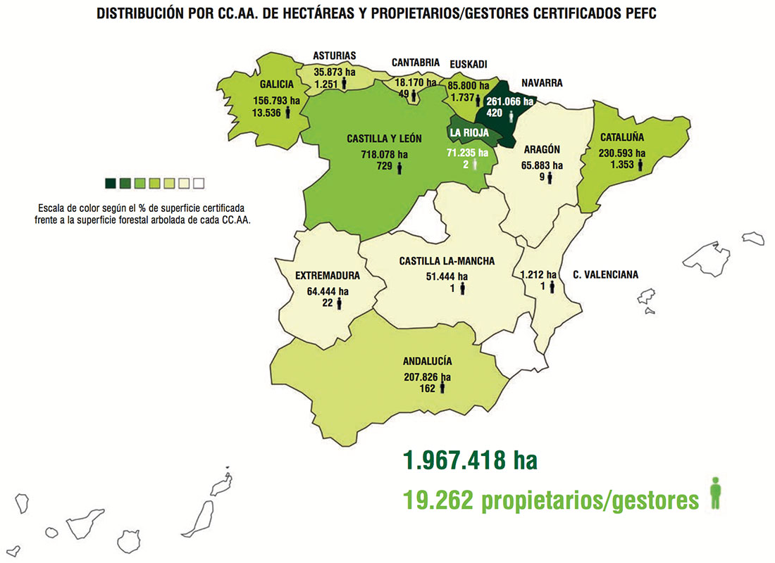 A cierre de 2016, en España hay 1.967.418 hectáreas de bosque, 19.262 selvicultores, propietarios y gestores forestales y 1.271 empresas que cuentan con la certificación PEFC.