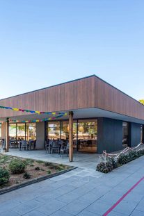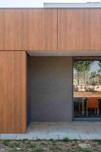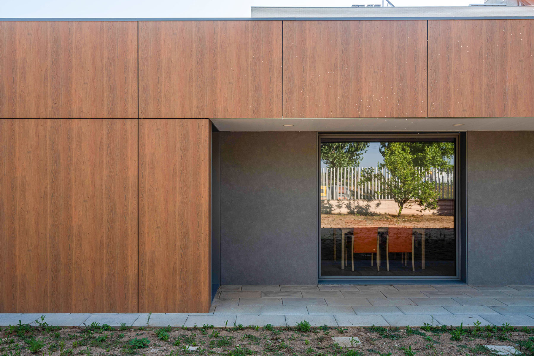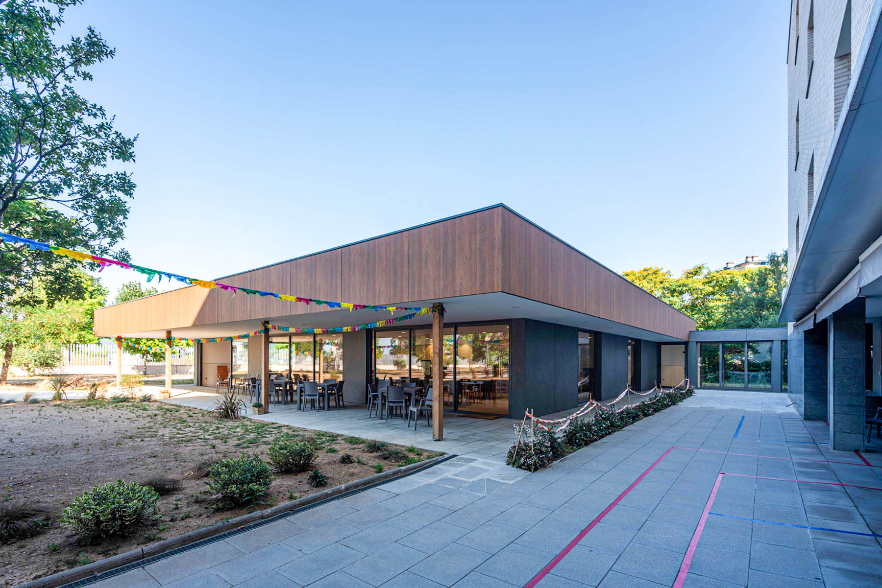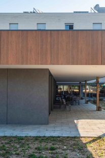 La ampliación se resuelve mediante una estructura de madera, un sistema constructivo que permite una ejecución precisa, eficiente y con una baja huella de carbono. La madera, además de su carácter sostenible, aporta calidez, confort acústico y una percepción sensorial positiva, especialmente relevante en entornos destinados al cuidado y la atención a personas mayores.