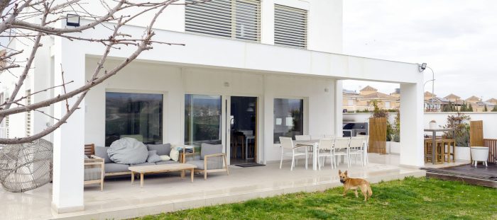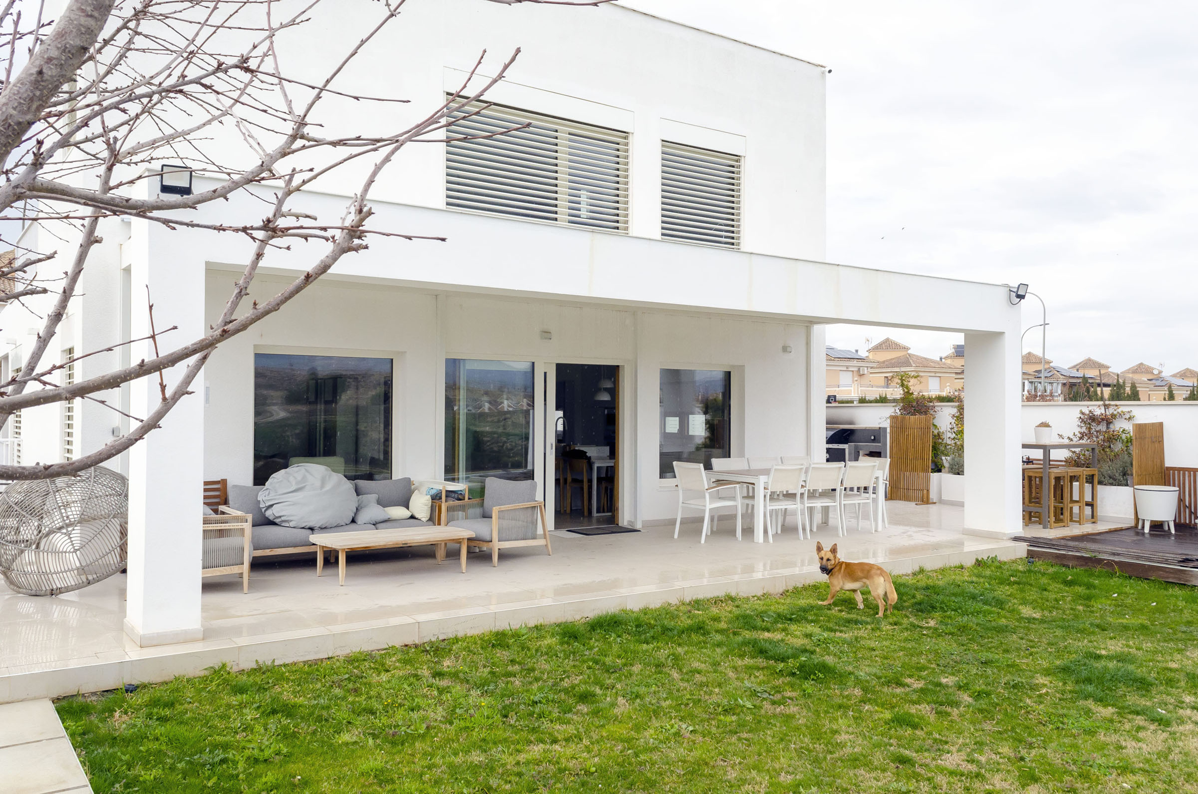 Una gran pérgola orientada al sur, cubierta con cañizo, actúa como elemento bioclimático clave, proporcionando sombra y protección solar durante los meses de verano, al tiempo que permite el paso del sol en invierno, reforzando el confort térmico de la vivienda de forma pasiva.