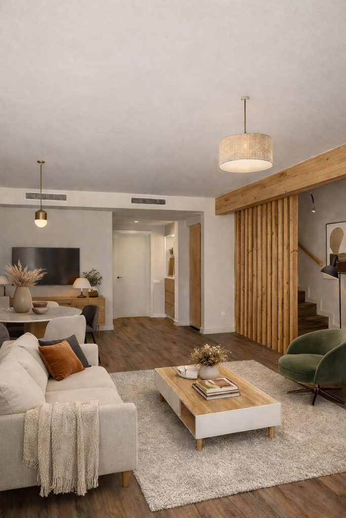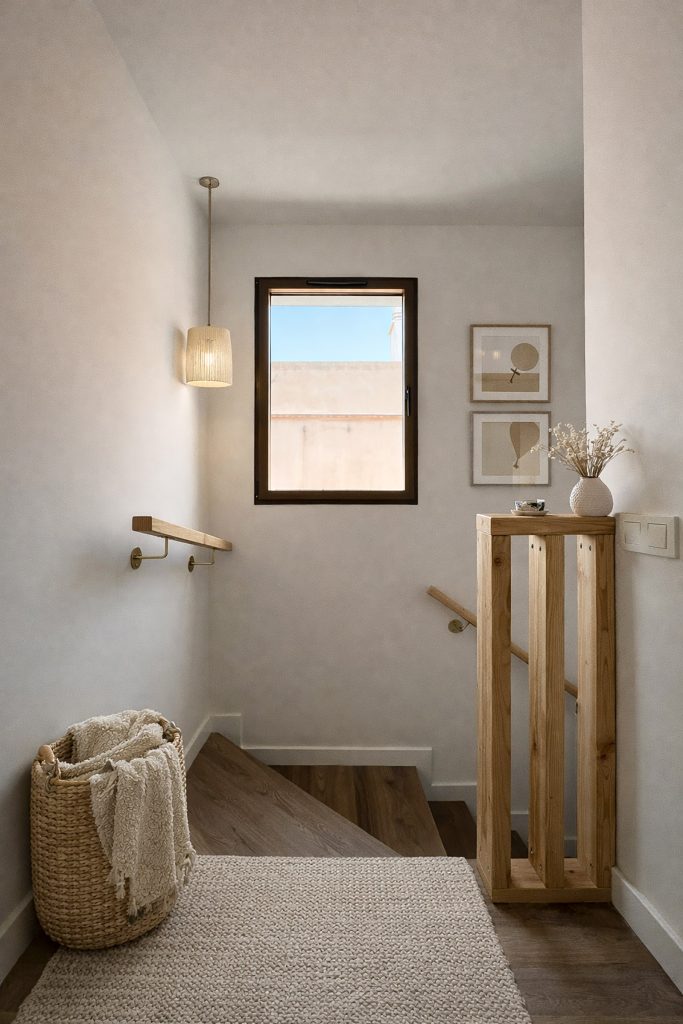 La distribución interior se organiza en dos niveles, correspondientes a la tercera y cuarta planta, configurando una vivienda amplia y funcional que incluye cuatro dormitorios, dos baños, lavadero y un espacio de estar-comedor con cocina integrada. La relación con el exterior se refuerza mediante terrazas vinculadas a ambas plantas, que amplían el espacio habitable y favorecen la entrada de luz natural y la ventilación cruzada.