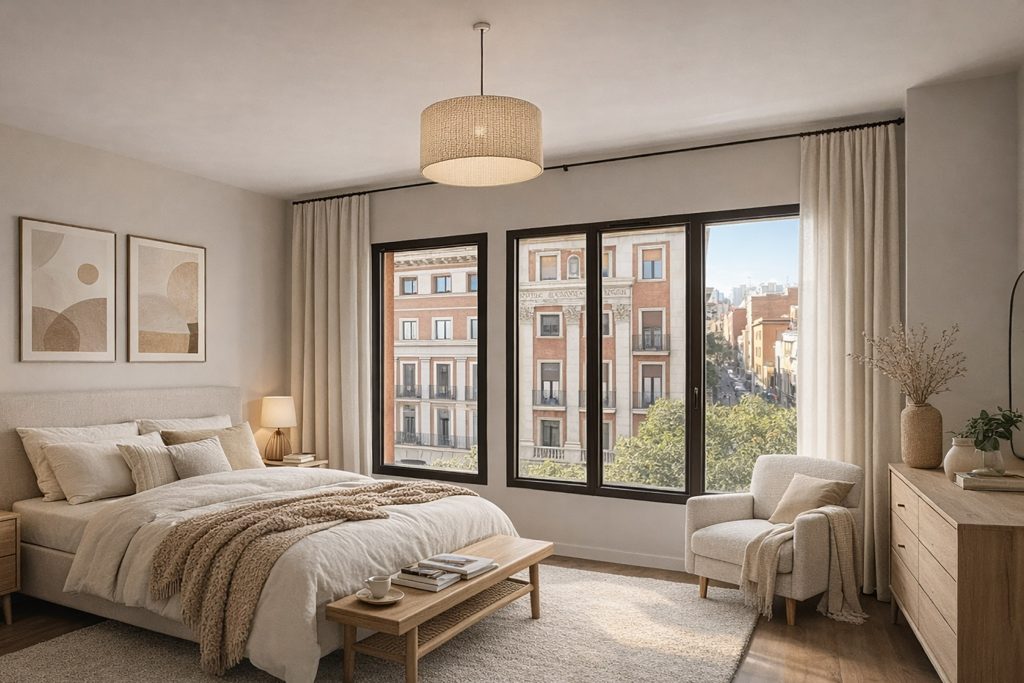 La envolvente del edificio se ha diseñado como un sistema de altas prestaciones térmicas, incorporando aislamiento continuo en el interior de los cerramientos y un sistema de aislamiento térmico por el exterior (SATE), de fibra de madera acabado con revoco mineral de cal que asegura durabilidad, transpirabilidad y una integración respetuosa con el entorno urbano.